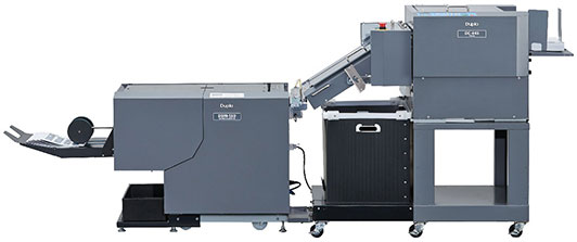 With the entry-level 150 Digital Booklet System, the DBM-150S/T Bookletmaker and Trimmer integrate the stapler, folder, and face trimmer into one. The DSF-2200 Sheet Feeder, with front/side air separation and an anti-static device, handles the output printed from your digital presses and offers a barcode reader option to process variable data with integrity. With a speed of up to 1,720 booklets per hour, the 150 Digital Booklet System delivers a variety of applications, from catalogs to corporate reports, on demand.